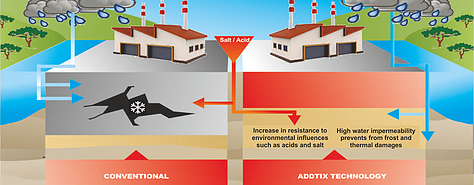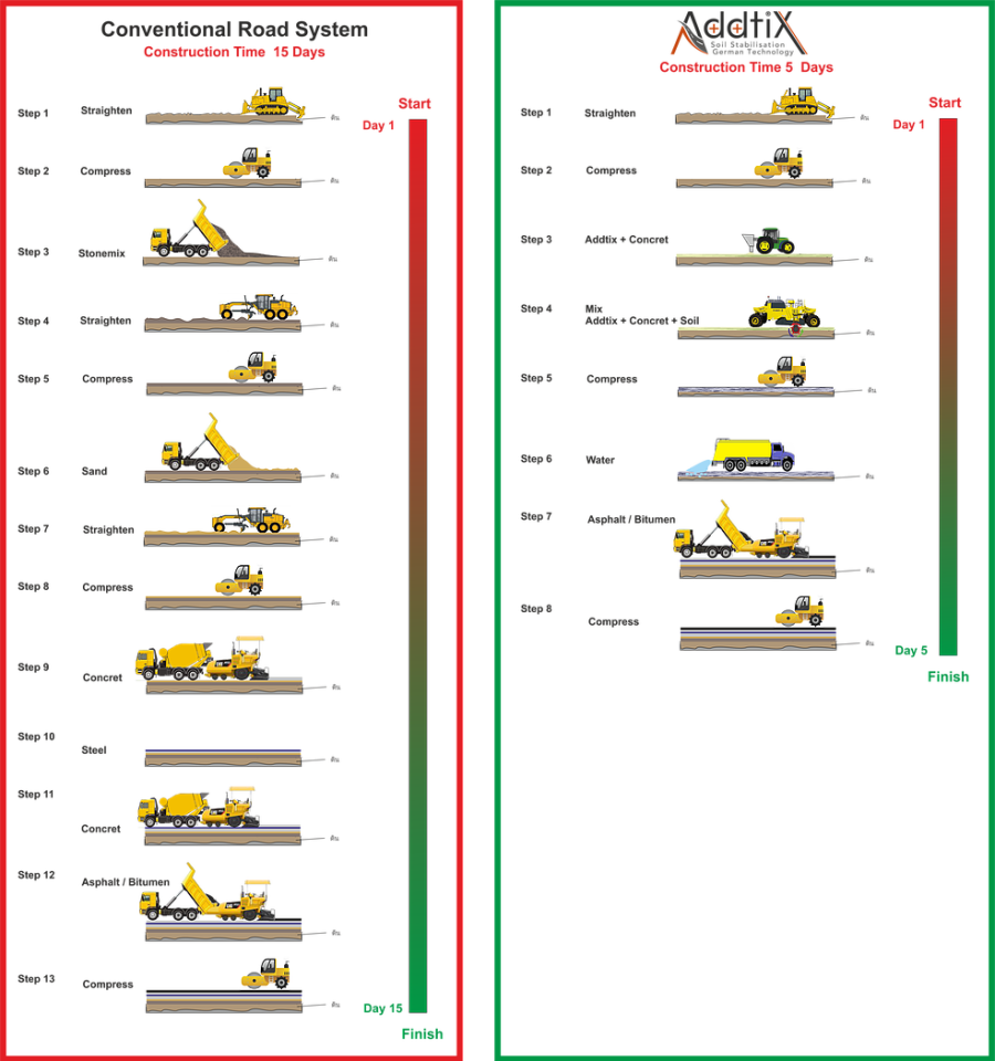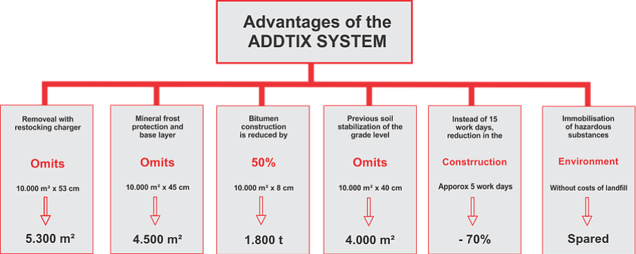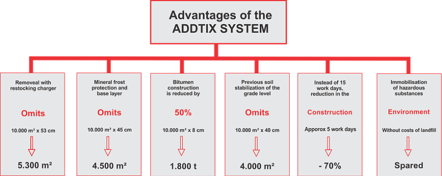 Our product AddtiX ST for soil stabilization is the result of more than 20 years of research and development and a permanent process of innovation for our worldwide clients. There have been previous products on the market with different names that were all developed in the basement of a small startup company at Schöffengrund, Germany. The present product AddtiX ST is the most advanced of all worldwide products for soil stabilization (6h level of innovation). Various tests of independent institutes have proved that AddtiX ST meets all individual requirements in an optimal way. Using AddtiX ST in various construction projects worldwide under different geological and climatical circumstances has resulted in average savings of money and time of 30%.