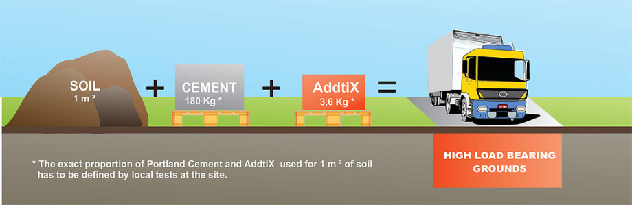 The application is quite simple: AddtiX ST is just mixed with Portland cement and the existing soil in a special ratio depending on the required stability of the target area.